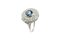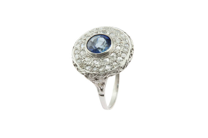 in oro bianco, sommità rotonda con al centro gemma sintetica di colore blu taglio rotondo e rosette di diamanti per totali ct 1,30 ca