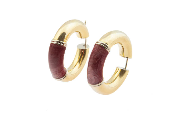 in oro giallo e smalto bordeaux, a forma di cerchio bombato (ammaccature)