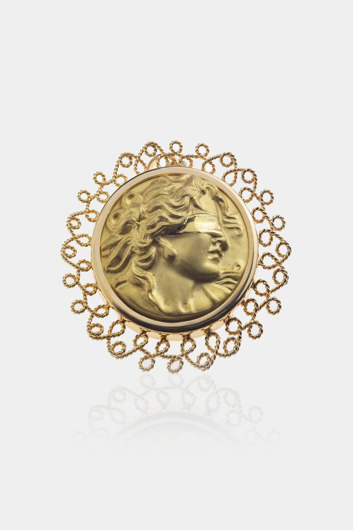 in oro lucido e satinato, al centro medaglione sbalzato raffigurante l'allegoria della Fortuna, bordo lavorato e intrecciato a corda