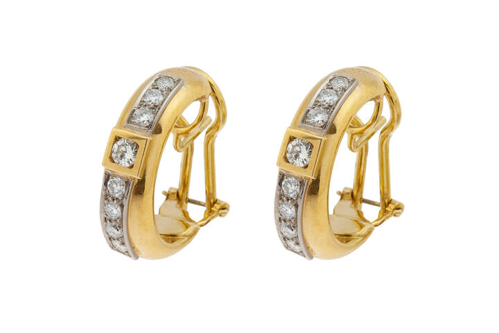 in oro giallo, a mezzo cerchio, con parte anteriore in diamanti taglio brillante per totali ct 0,80 ca, probabile colore G-H, purezza IF-VVS