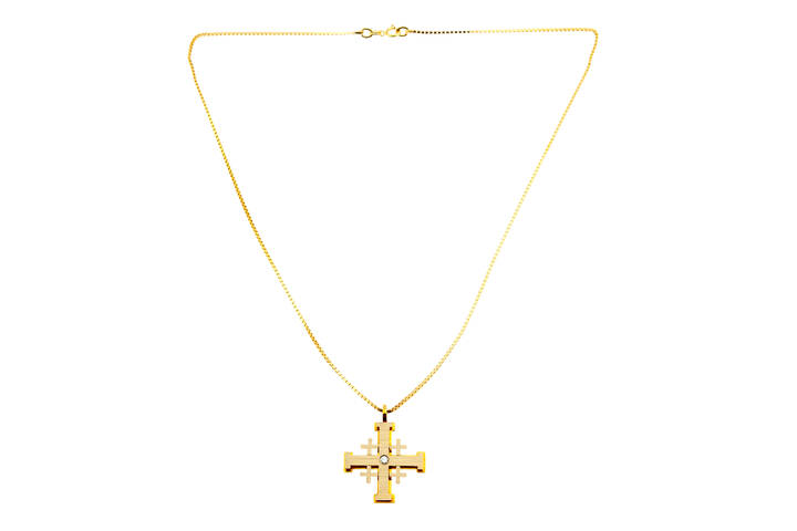 in oro giallo 14 Kt con ciondolo in oro 18 Kt lucido e satinato a forma di croce con al centro piccolo diamantino di ct 0.05 ca