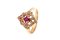 in oro rosa, sommità romboidale arabescata con rubino centrale di ct 0,23 ca e diamanti taglio brillante per totali ct 0,20 ca, probabile colore G-H, purezza IF-VVS