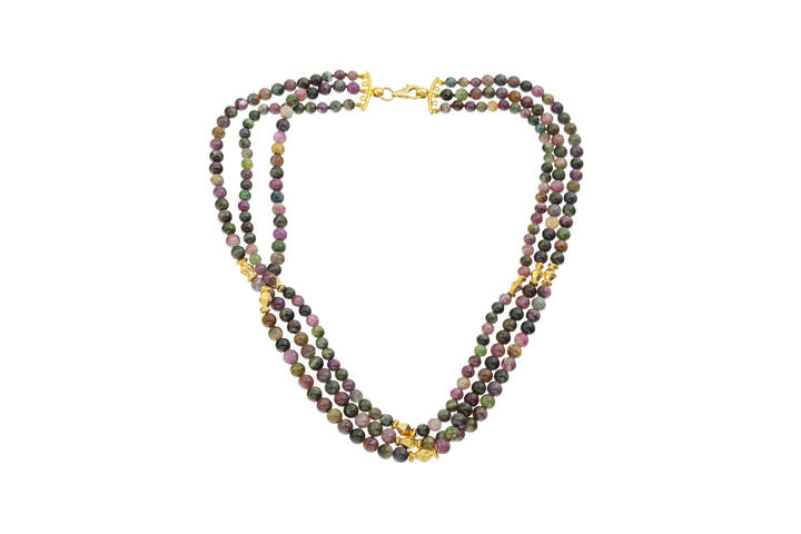 composta da tre fili di sfere di tormaline nei toni del verde e del viola: distanziali e chiusura in argento dorato