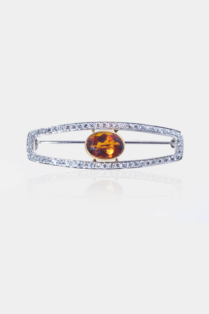 in oro bianco e giallo, di forma ovalizzata con angoli smussati; al centro quarzo topazio madera taglio ovale e contorno di diamanti taglio 8/8 per totali ct 1,50 ca