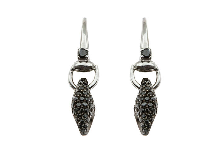 Coppia di orecchini in oro bianco ad amo, firmati "Gucci", con due nodi marinari pendenti con pavé di diamanti neri per totali ct 1,0 ca