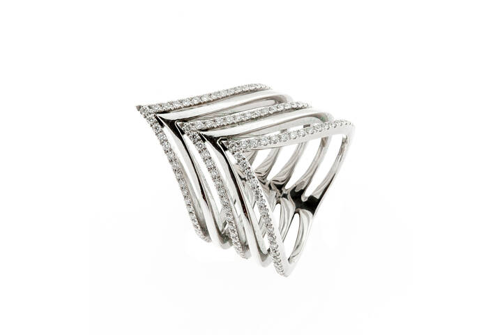 in oro bianco, sommità a punte, con diamanti taglio brillante per totali ct 0,57 ca, probabile colore G-H, purezza IF-VVS