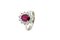 in oro bianco, a margherita, con al centro rubino taglio ovale di ct 1,38 ca e contorno di diamanti taglio brillante per totali ct 0,83 ca, probabile colore G-H, purezza IF-VVS