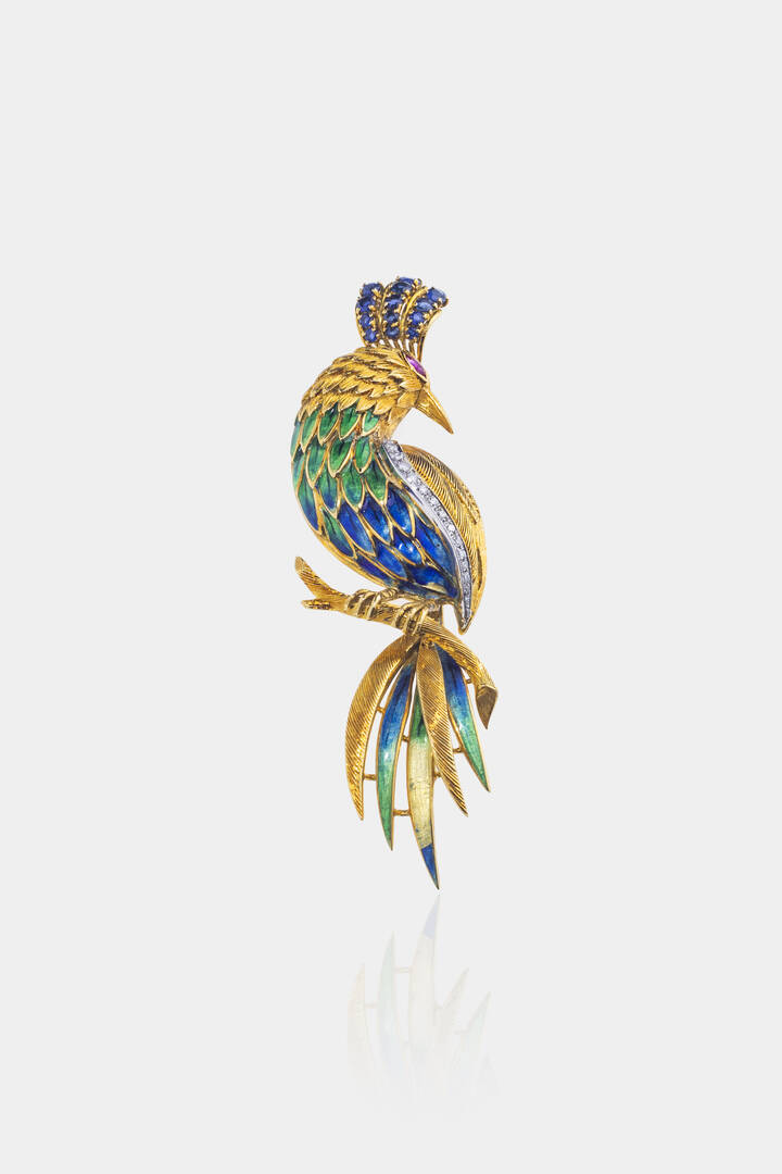 in oro giallo, anni '50, a forma di uccello del paradiso interamente in smalti policromi (difetti). Diamanti taglio 8/8 e brillante per totali ct 0,20 ca; zaffiri taglio rotondo a decoro del ciuffo per totali ct 0,65 ca