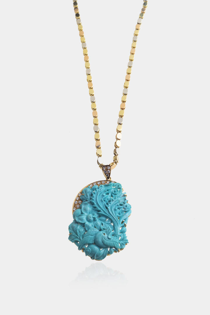 in oro giallo a maglia ovalizzata specchiata nei tre colori dell'oro, recante ciondolo in turchese inciso a motivi floreali e vegetali. Diamanti taglio brillante per totali ct 0,60 ca
