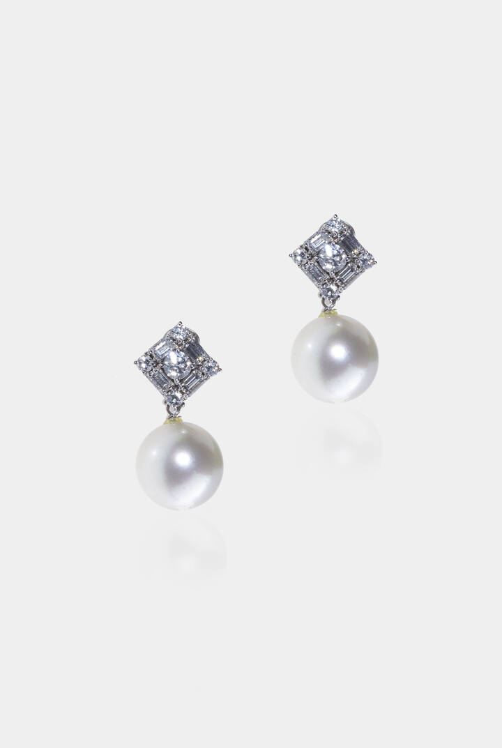 in oro bianco, a clip, con ai lobi elementi quadrati in diamanti taglio brillante e baguette per totali ct 2,50 ca, terminanti con due perle australiane del diam di mm 14