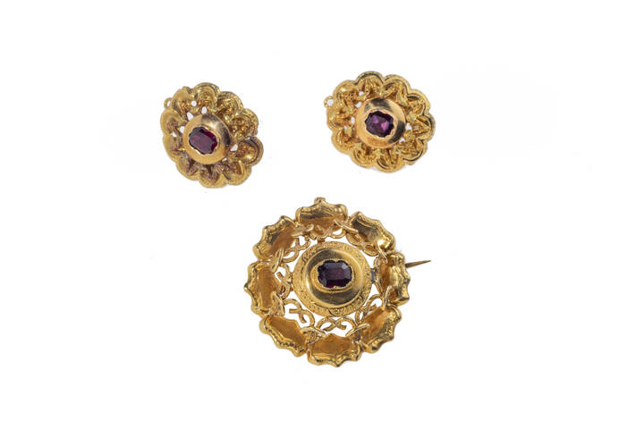 XIX secolo, in oro giallo, composta da coppia di orecchini a vite e spilla con granati
