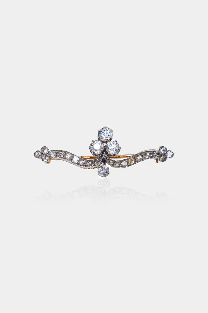 in oro bassa caratura ed argento, sommità a volute con diamanti taglio brillante di vecchio taglio e rosette per totali ct 1,50 ca