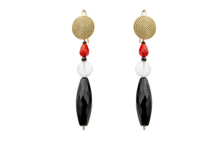 pendenti in argento dorato con gocce briolette di onice e sfere di cristallo di rocca