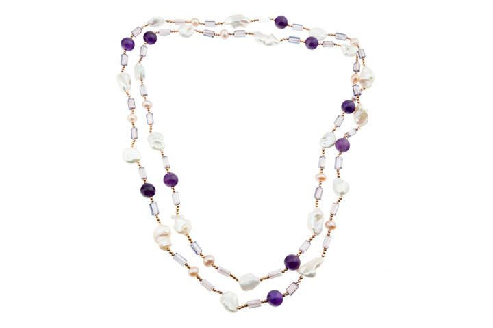 composta da un filo di perle di acqua dolce scaramazze e cipolline alternate a parallelepipedi di ametiste e perle