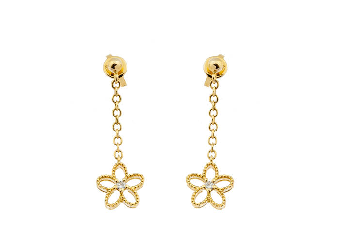 pendenti, in oro giallo, terminanti due fiori. Diamanti taglio brillante per totali ct 0,06 ca