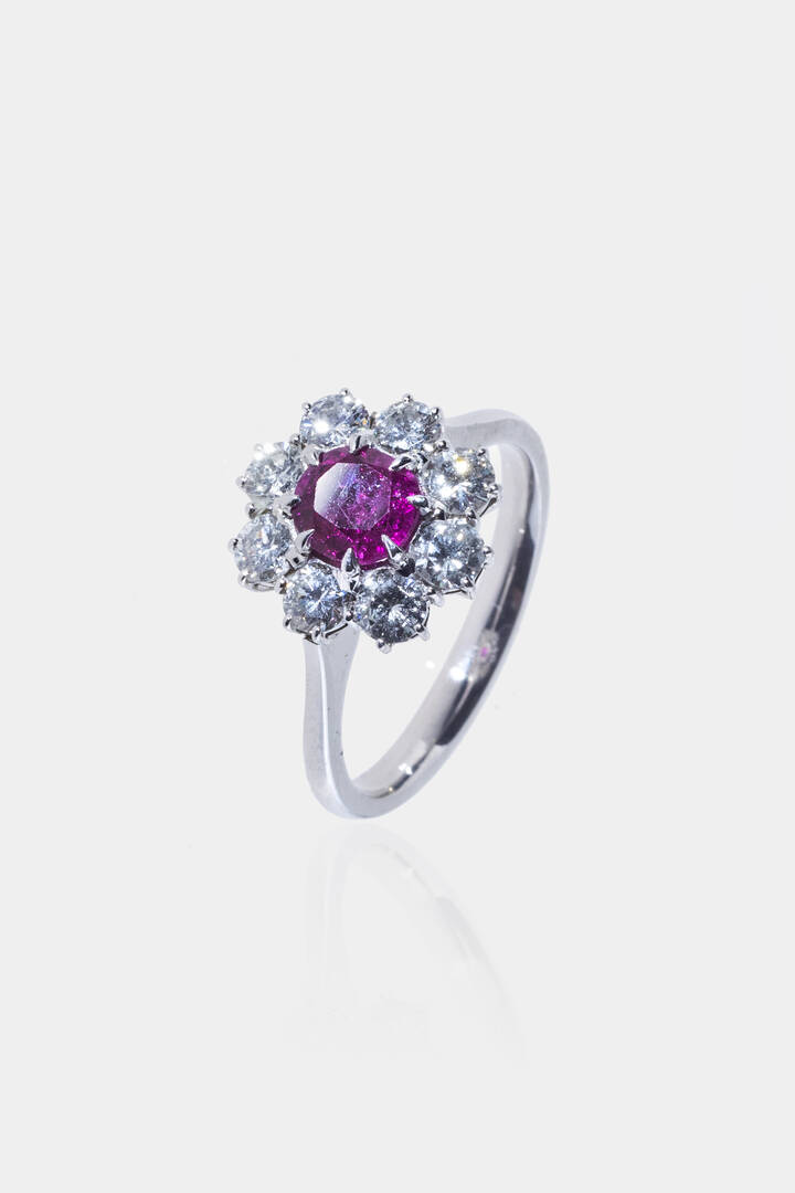 in oro bianco, a margherita, con rubino di ct 0,70 ca e contorno di diamanti taglio brillante per totali ct 0,65 ca