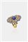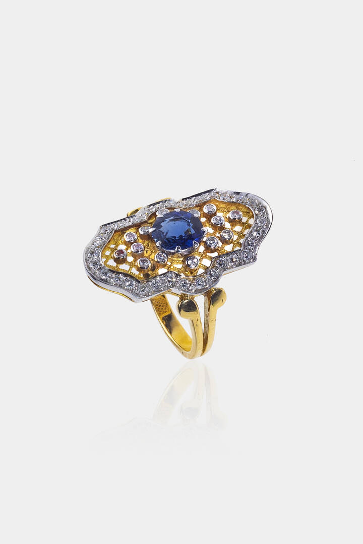 in oro giallo e bianco, sommità a voluta con al centro uno zaffiro taglio rotondo di ct 0,80 ca e diamanti taglio brillante per totali 0,40 ct ca