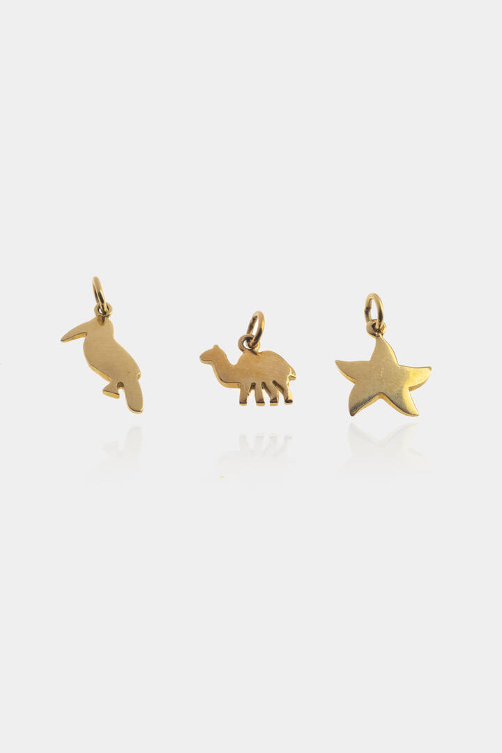 Lotto di tre ciondoli in oro giallo, firmati "Pomellato", modello "Dodo", raffiguranti un cammello, una stella e un tucano