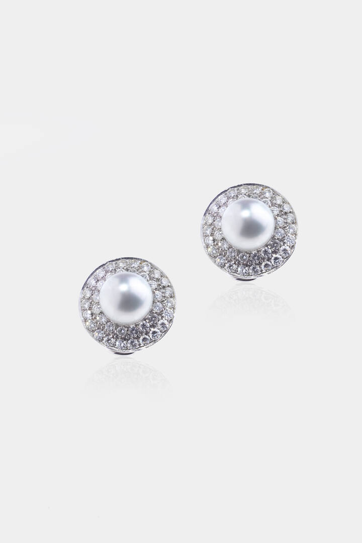 in oro bianco, di forma rotonda, a clip, con al centro due perle giapponesi del diam di mm 9,8 ca e contorno di diamanti taglio brillante per totali ct 1,80 ca