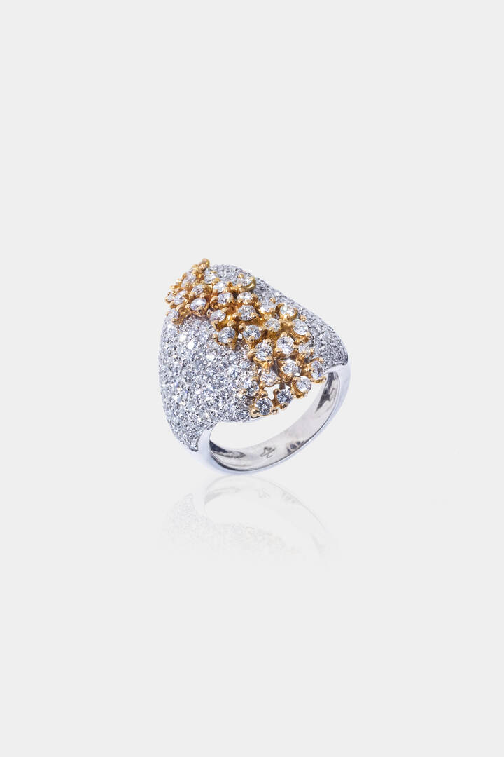 in oro bianco, sommità mossa, con fascia centrale in oro giallo interamente in diamanti taglio brillante per totali ct 3,11 ca, probabile colore G, purezza IF-VVS