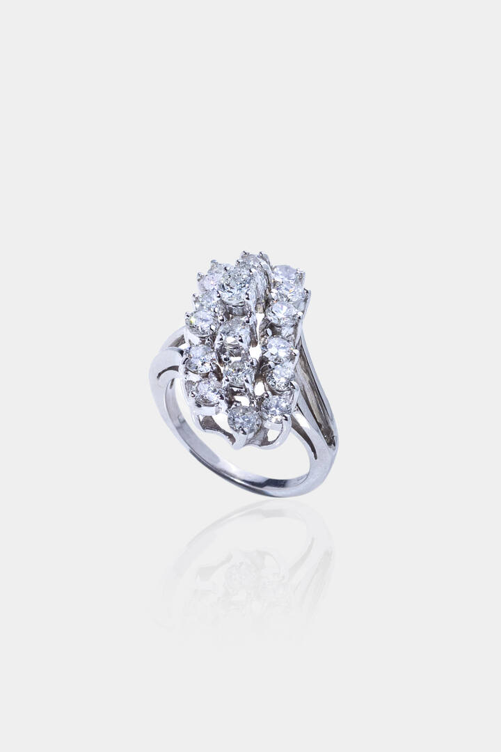 in oro bianco 14 Kt, sommità a fascia obliqua con diamanti taglio brillante per totali ct 1,0 ca