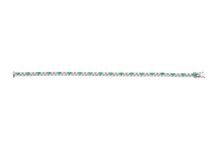 in oro bianco, modello tennis, con diamanti taglio brillante per totali ct 1,61, probabile colore F-G, purezza IF-VVS, alternati a smeraldi taglio rotondo per totali ct 0,68 ca