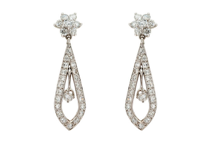 in oro bianco 14 Kt, fiori ai lobi e gocce in diamanti taglio brillante e 8/8 per totali ct 1,50 ca