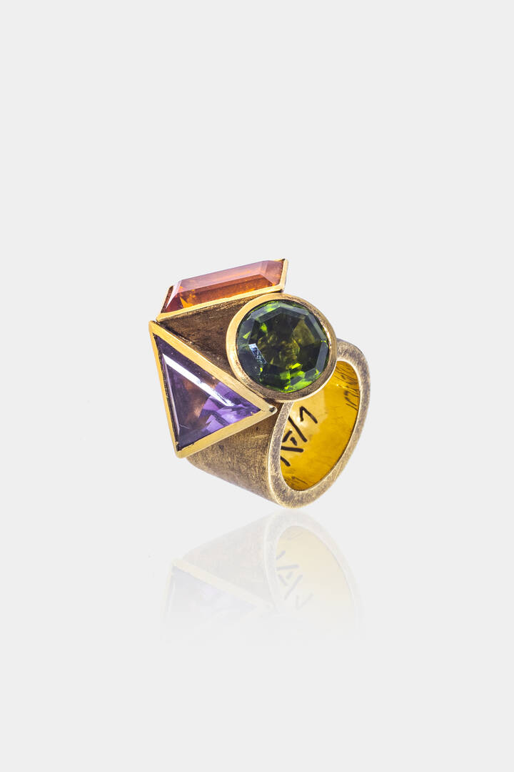 Grande anello scultura, firmato "Yayoi Tsuji", in oro giallo, a fascia, con sommità recante un'ametista taglio triangolare, un'olivina taglio rotondo e un quarzo taglio ottagonale a gradini