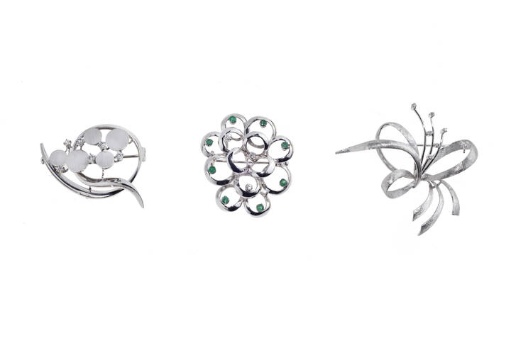 -spilla in oro bianco a volute, anni '50, con smeraldi taglio rotondo per totali ct 0,50 ca e diamanti taglio brillante per totali ct 0,07 ca.