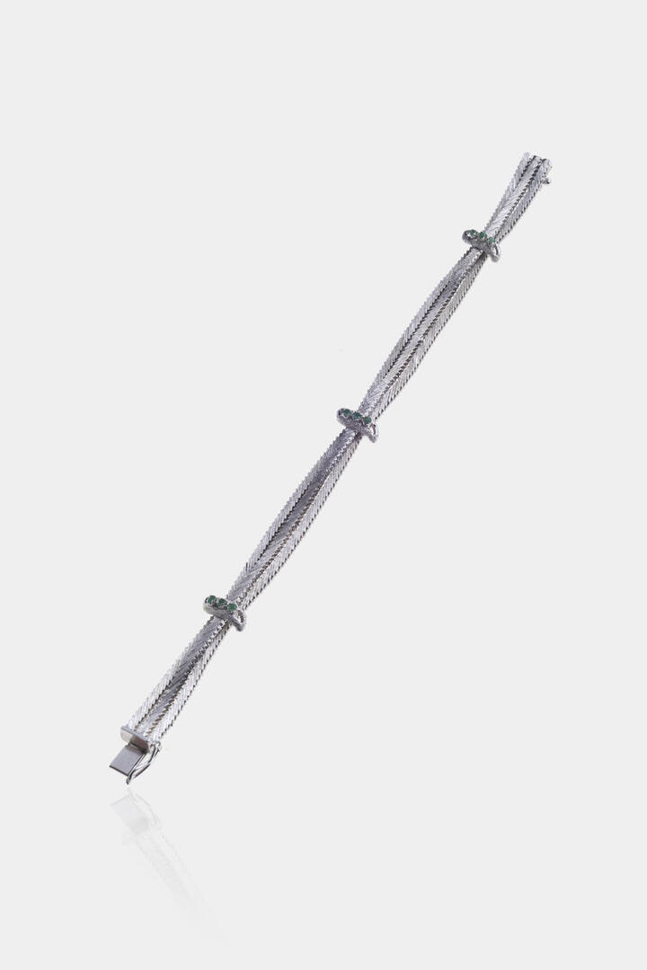 in oro bianco, composto da tre fasce satinate a lisca di pesce intrecciate tra loro. Smeraldi taglio rotondo a decoro per totali ct 0,30 ca