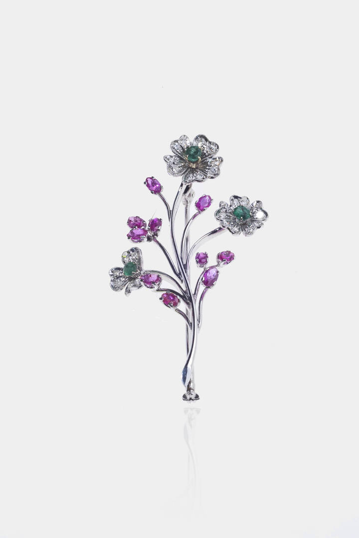 in oro bianco a forma di mazzo fiorito con diamanti taglio 8/8 per totali ct 0,30 ca, rubini taglio navette e goccia per totali ct 0,50 ca e tre smeraldi taglio rotondo per totali ct 0,35 ca