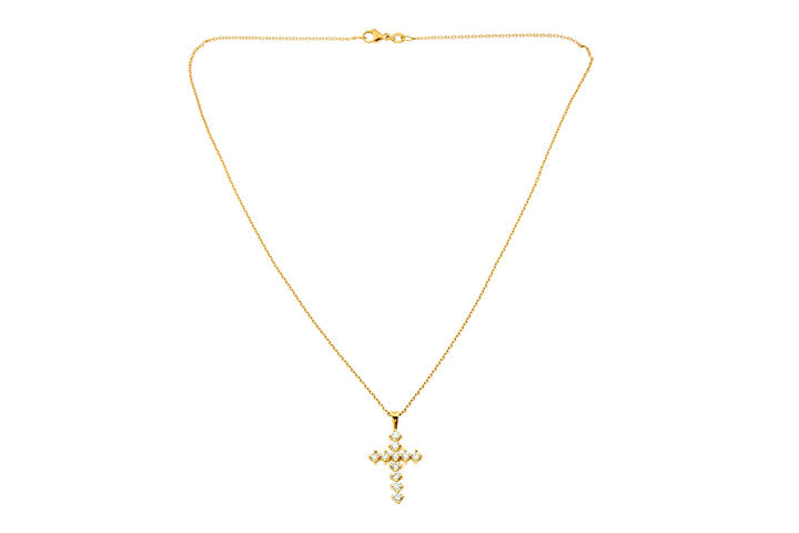 in oro giallo a forma di croce con diamanti taglio brillante per totali ct 0,70 ca, probabile colore G-H, purezza IF-VVS