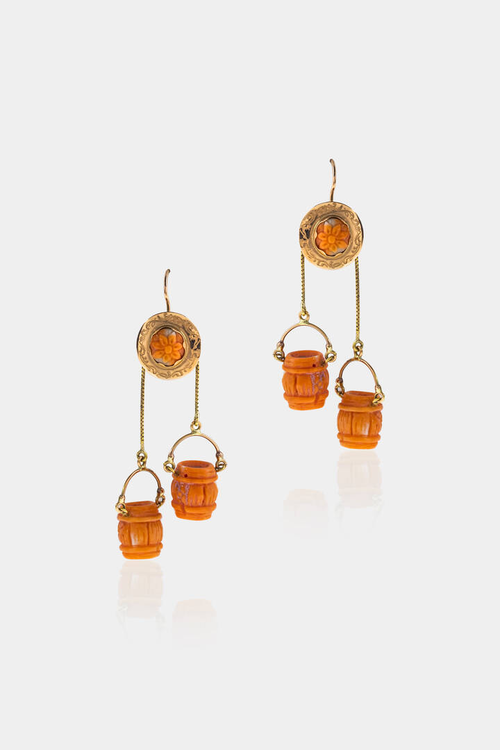 pendenti in oro a bassa caratura con corallo color salmone inciso a botte
