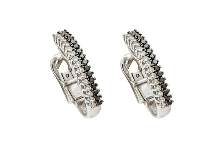 in oro bianco a forma di mezzo cerchio con due file di diamanti taglio brillante di colore bianco per totali ct 0,30 e neri per totali ct 0,40 ca