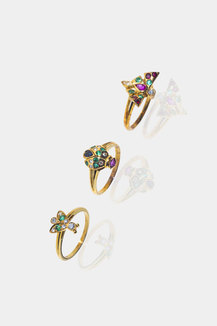 in oro giallo sommità recanti una coccinella, un moscerino ed una farfalla con rubini, zaffiri e smeraldi. Diamanti taglio brillante per totali ct 0,25 ca
