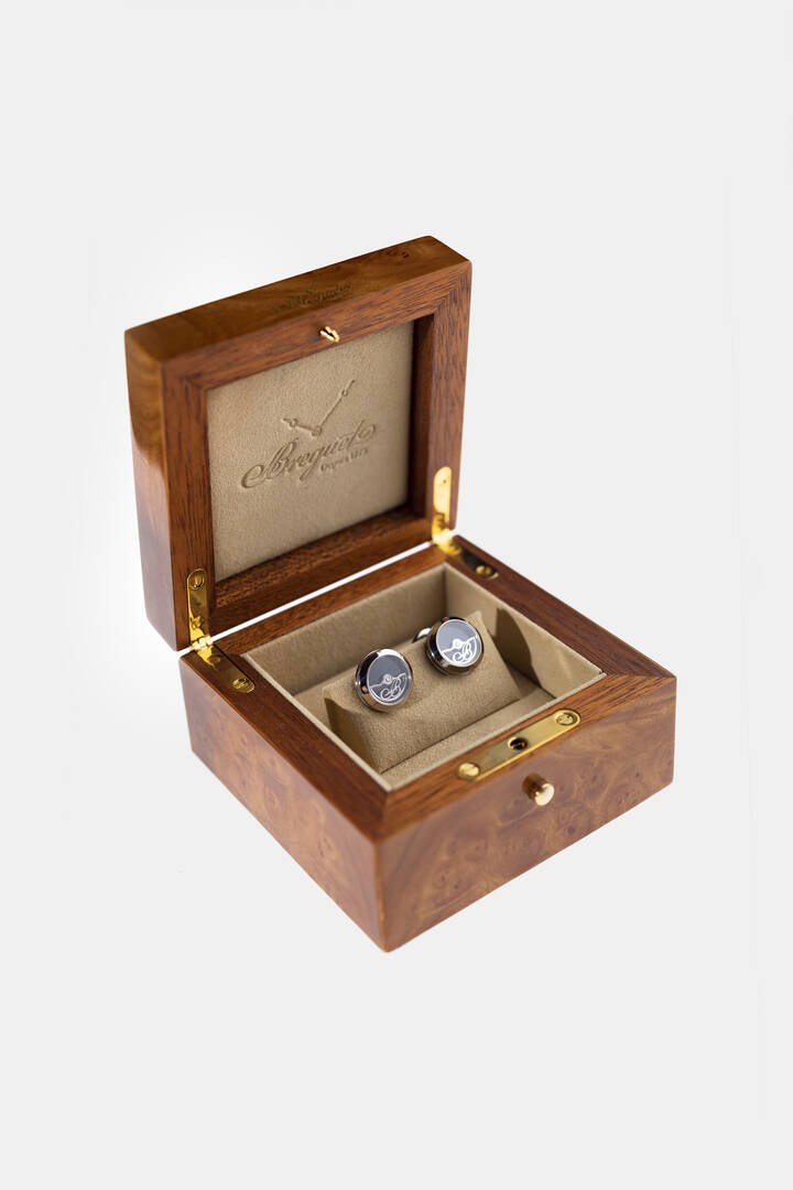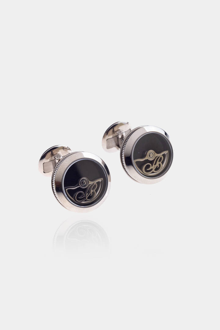 Coppia di gemelli in oro bianco, firmati "Breguet", di forma rotonda con parte in vetro recante elemento basculante con l'iniziale della maison
