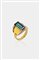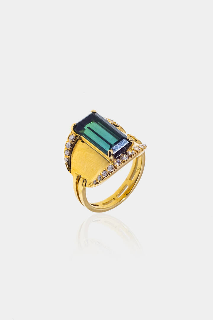 in oro giallo, sommità bombata con al centro tormalina taglio ottagonale a gradini e diamanti taglio brillante per totali ct 0, 40 ca
