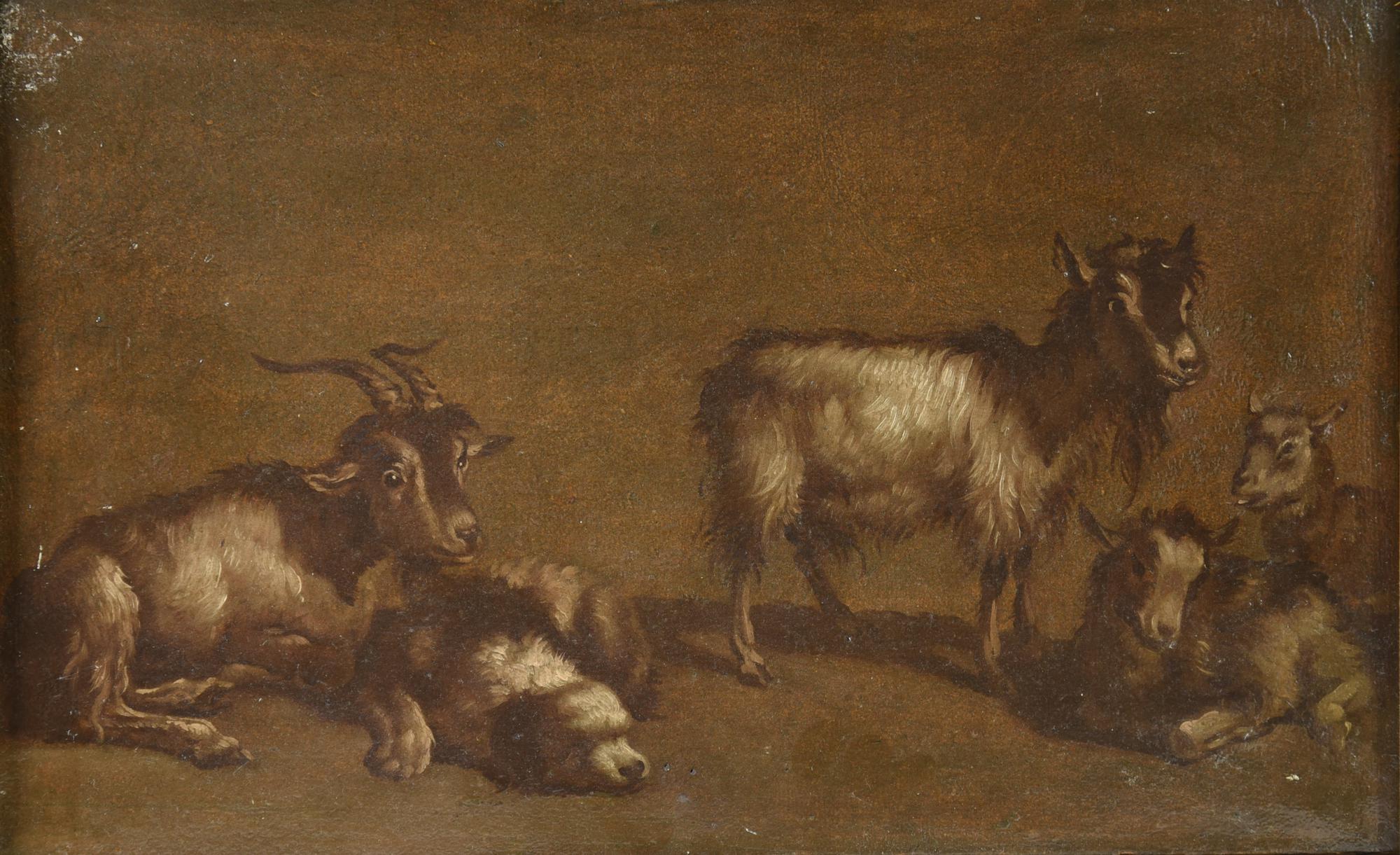 Maniera di Francesco Londonio CAPRETTE CON CANE olio su carta intelaiata, cm...