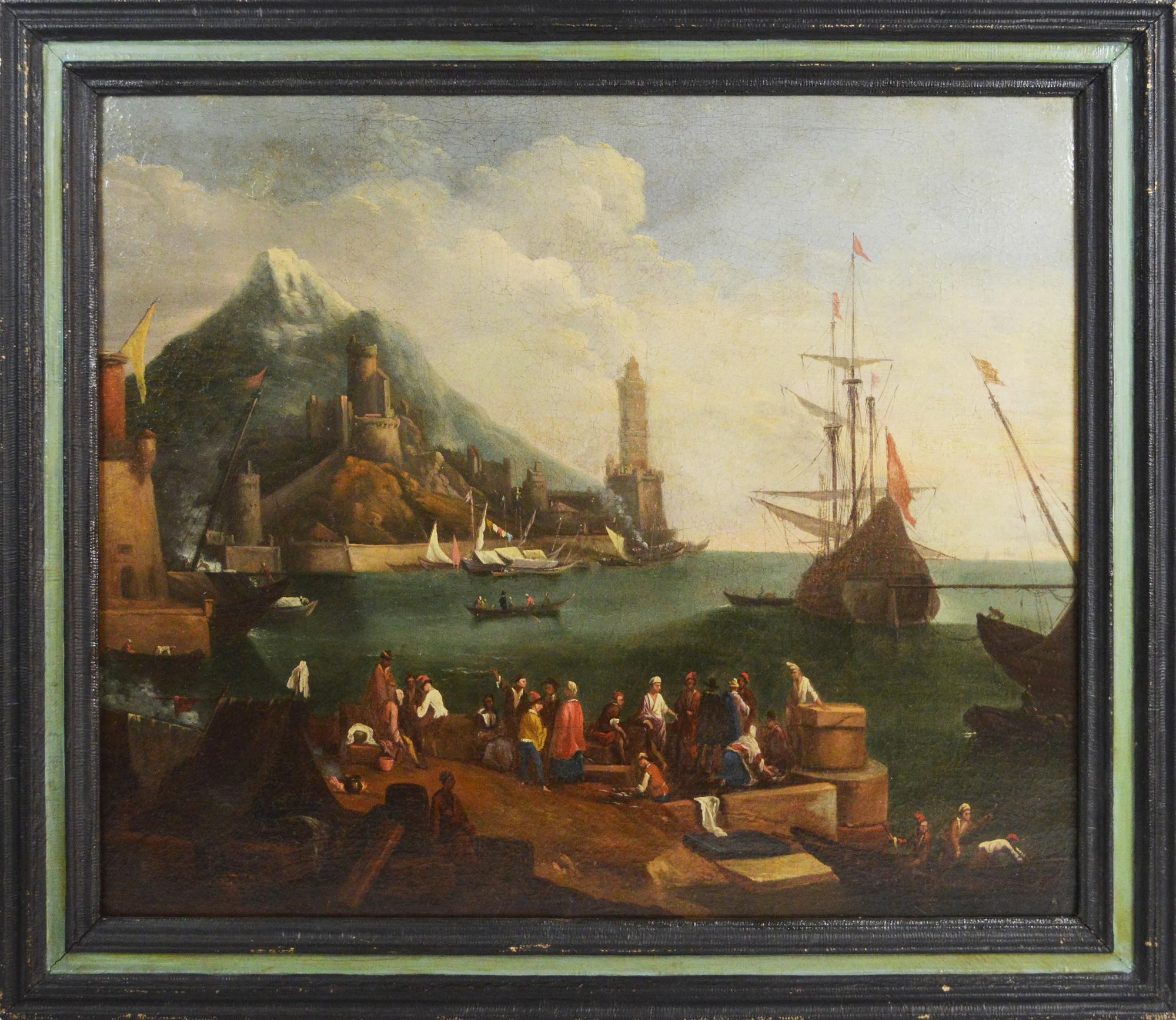 Maniera di Gherardo Poli (1674 - 1739) SCENA DI PORTO olio su tela, cm 56x66