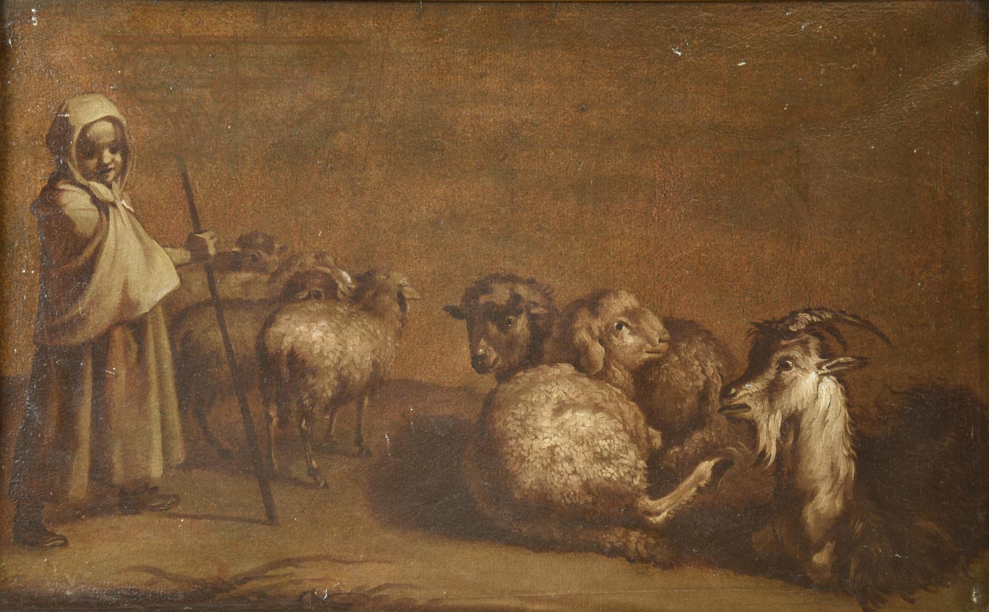 Maniera di Francesco Londonio PASTORELLA CON GREGGE olio su carta intelaiata,...
