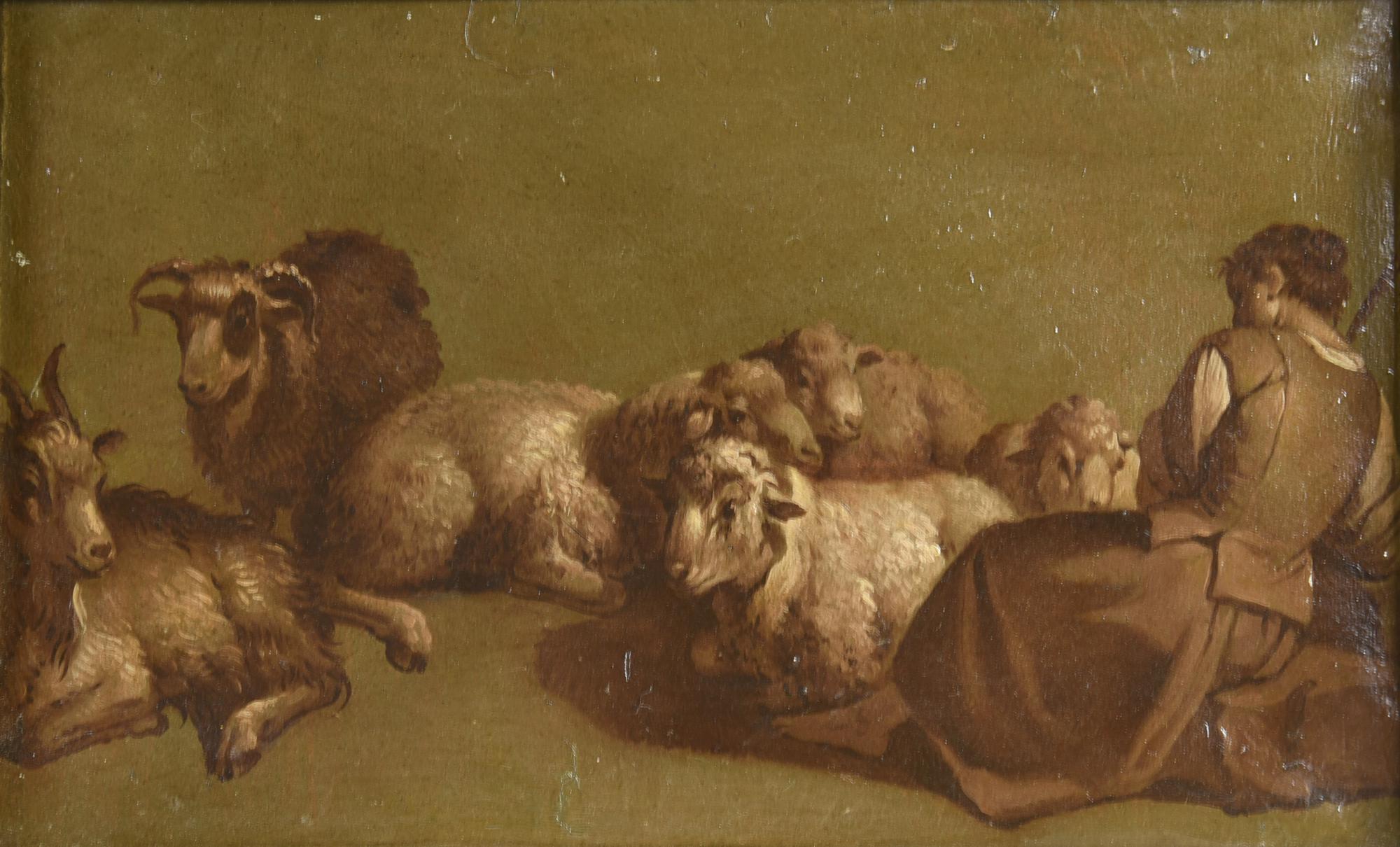 Maniera di Francesco Londonio PASTORELLA CON GREGGE olio su carta intelaiata,...
