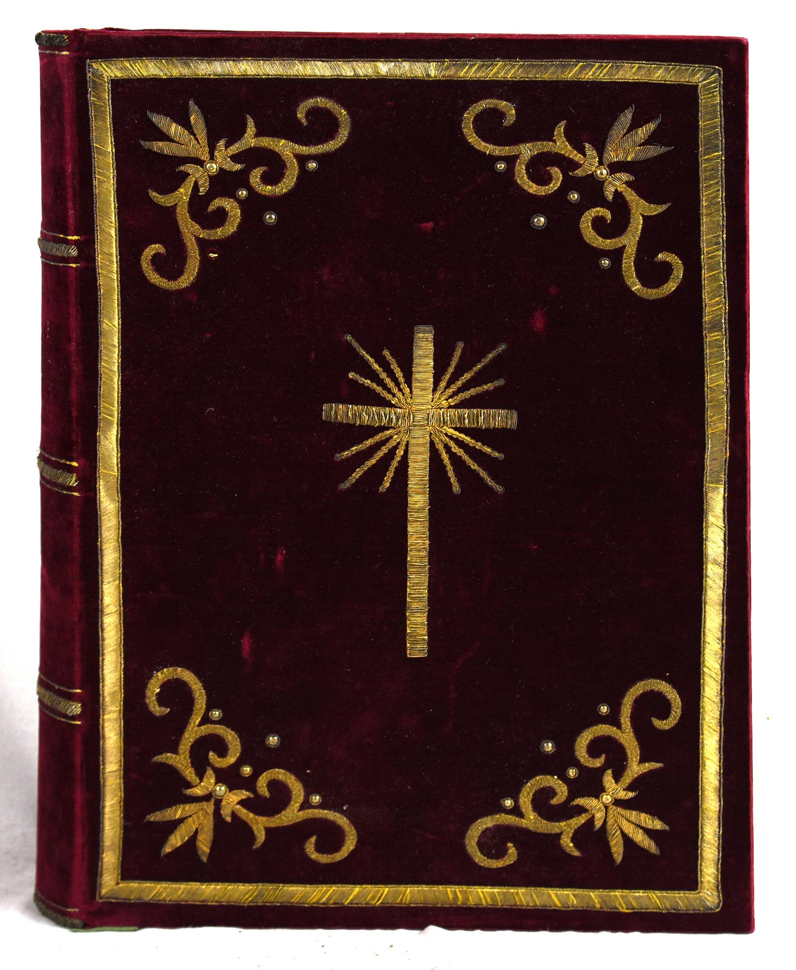 Ottime condizioni. Taglio dorato, legatura in velluto rosso con decorazioni a ricamo in oro, tre nervi a ricamo dorato