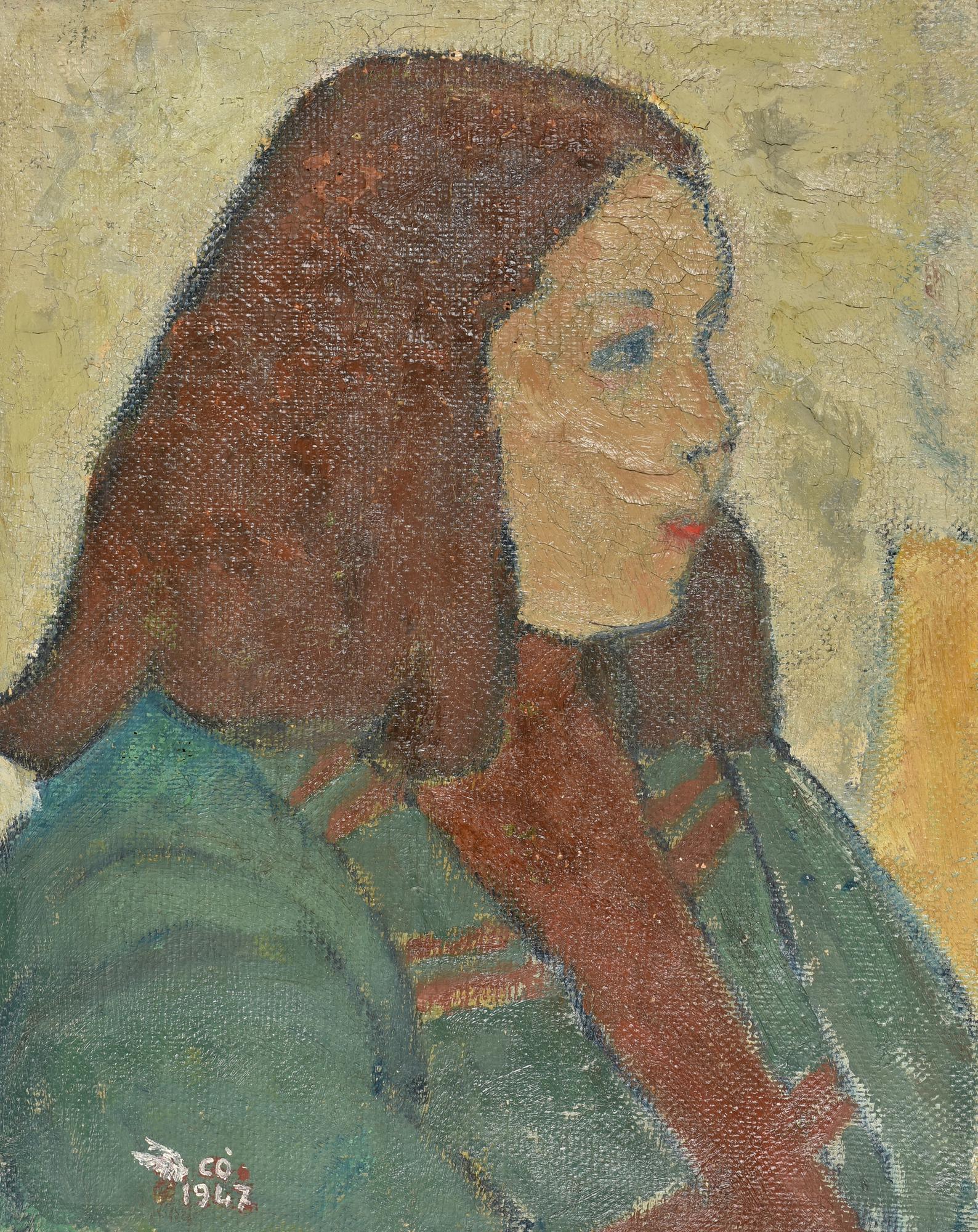 Ignoto RITRATTO FEMMINILE olio su tela grezza, cm 50x40 sigla e data eseguito...