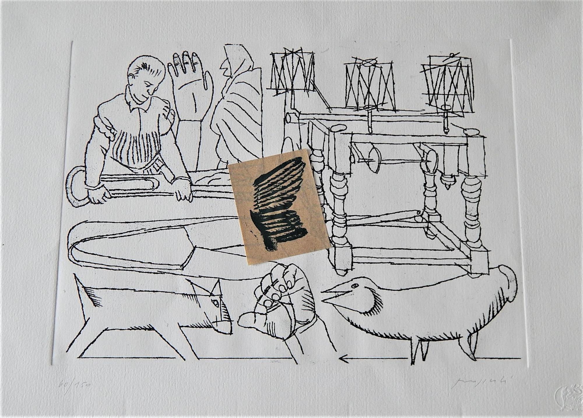 incisione e collage su carta, cm 25x34,5 su foglio 35x50; es. 60/150