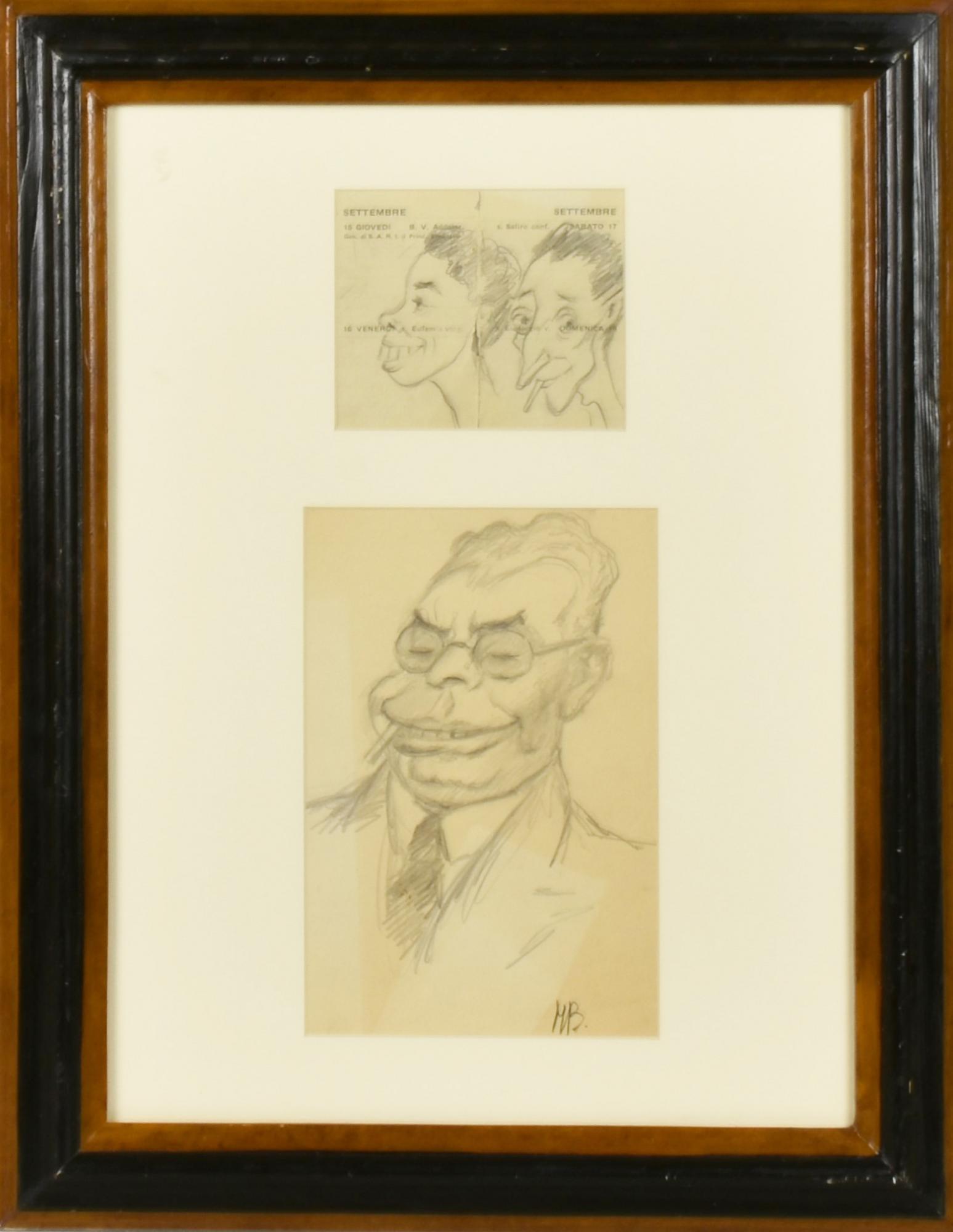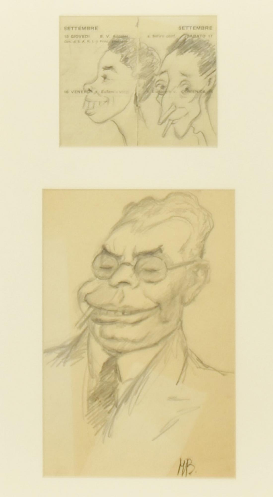 A firma MB CARICATURE due disegni a matita su carta, cm 20,5x14, cm 9,5x11,5