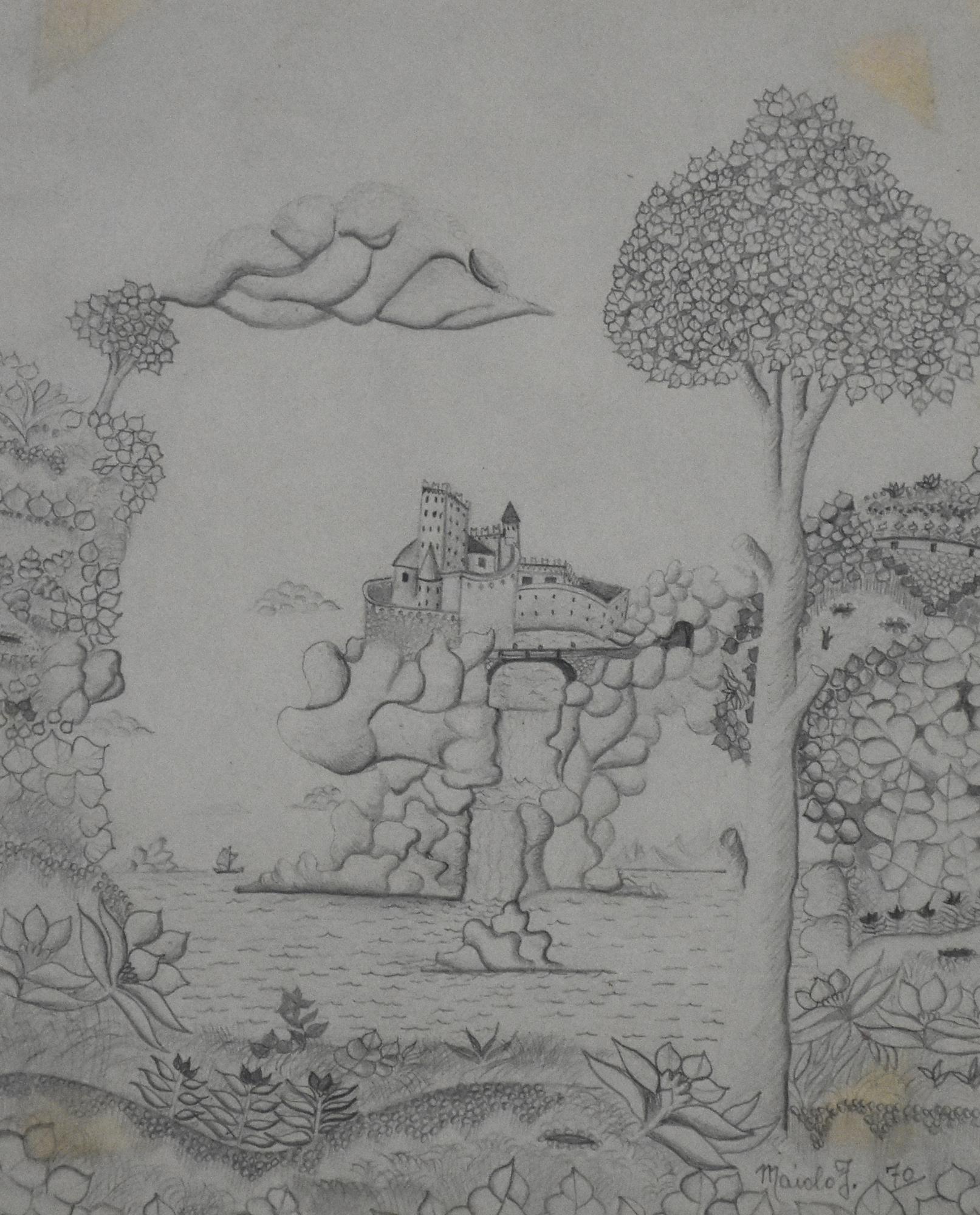 Francesco Maiolo CASTELLO FANTASTICO disegno su carta, cm 22,3x18 firma e...