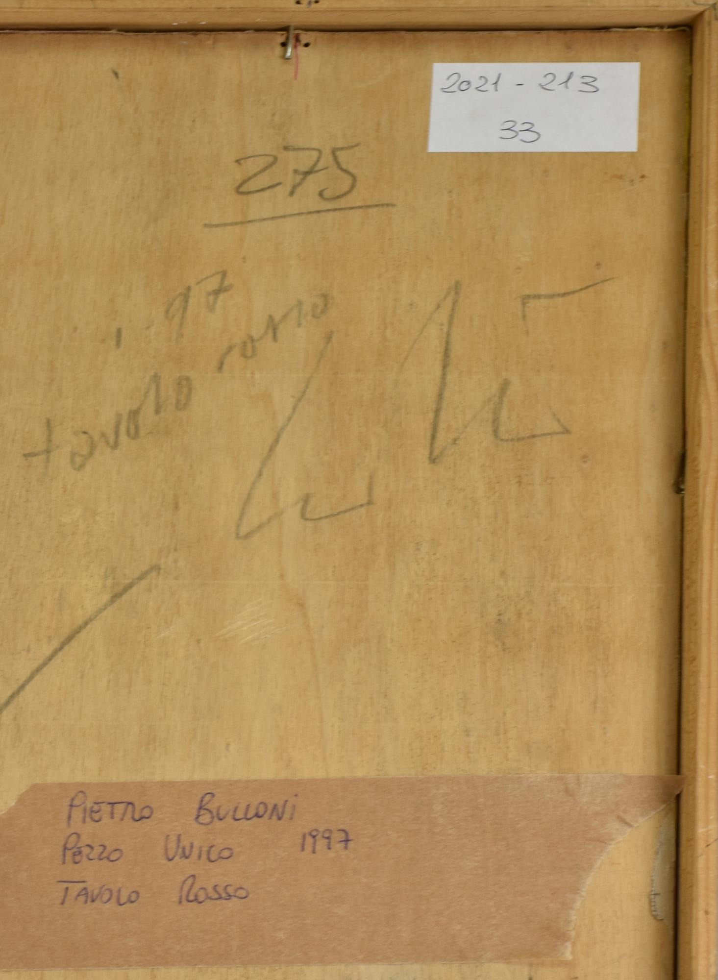 Pietro Bulloni TAVOLO ROSSO olio su tavola, cm 30x20 firma sul retro: firma,...