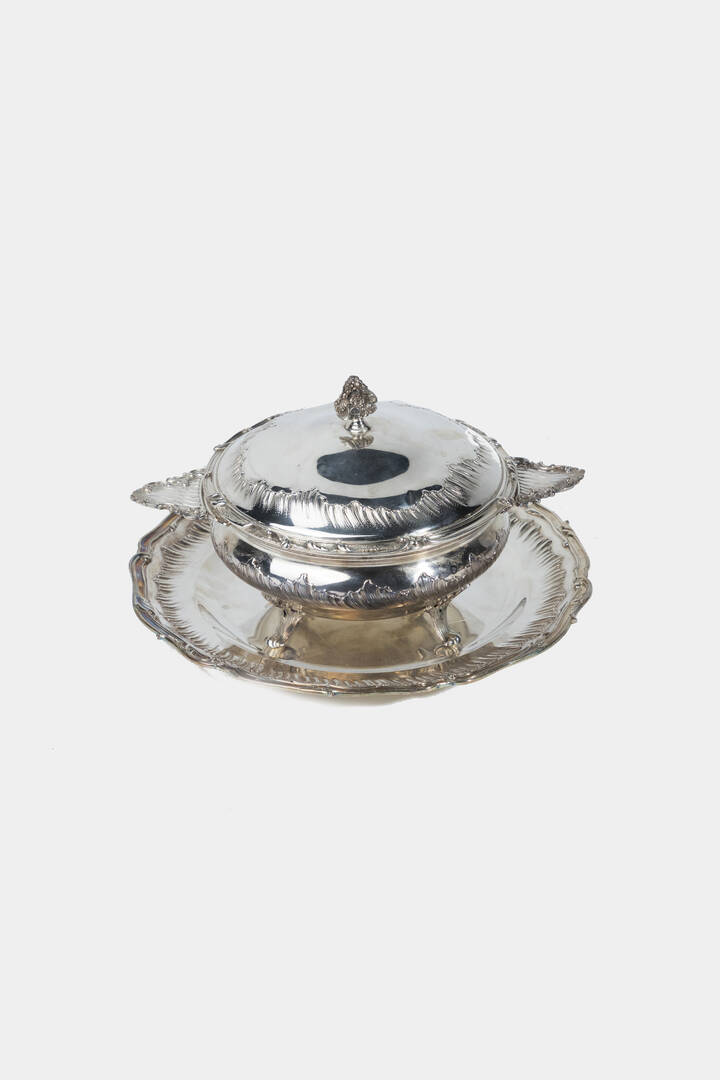 Francia 1840-1850 ca, marcata "Moutot-Paris". Interamente sbalzata e cesellata a motivi vegetali. Manici a volute; presa a motivo floreali