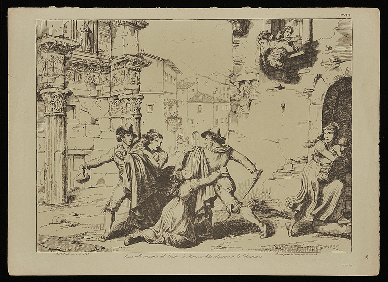 BARTOLOMEO PINELLI (1781-1835) E GIOVAN BATTISTA PIRANESI (1720–1778) Rissa nelle vicinanze del tempio di Minerva detto volgarmente le Colonnaccie Colonna Trajana Stampa su carta 385x274 mm. Dati in lastra Le stampe sono alle due facciate di una pagina, da un volume moderno