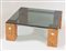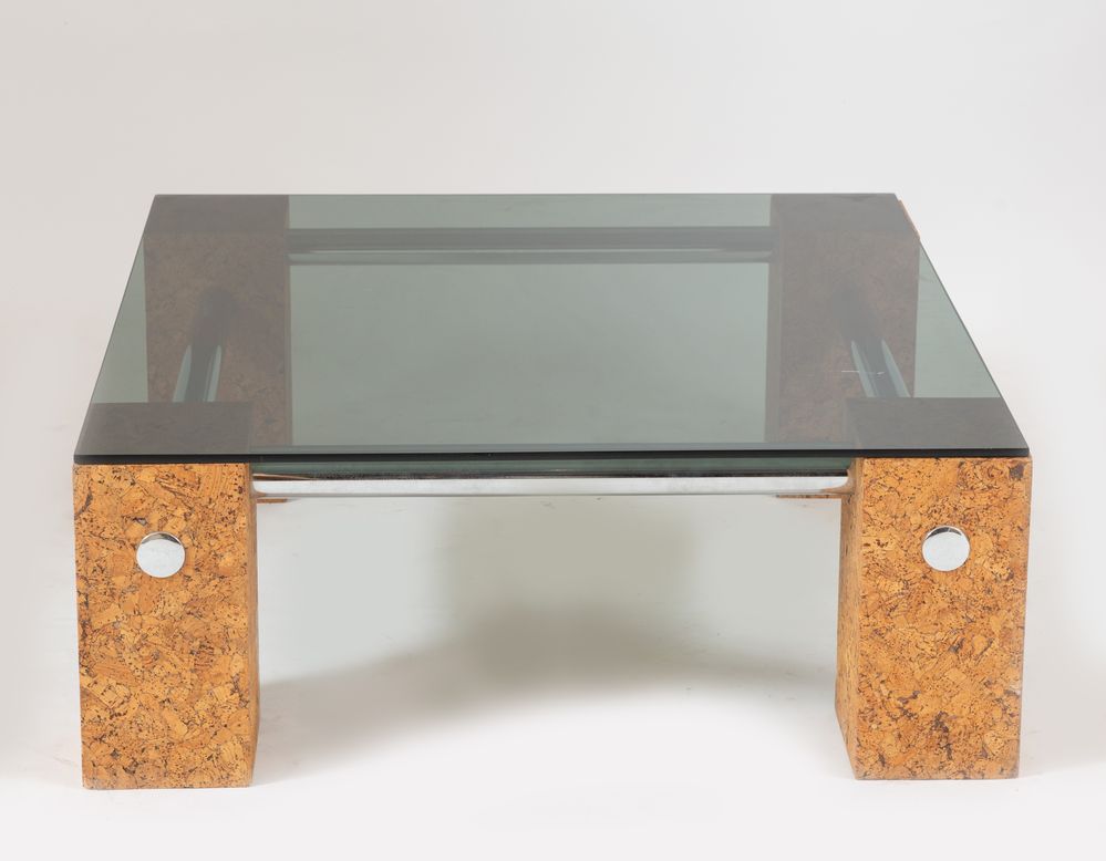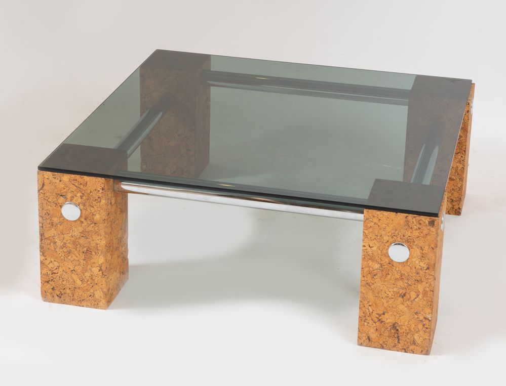 Tavolino da salotto con struttura tubolare in metallo cromato, gambe in sughero e piano in vetro fumé. Lievi difetti. Prod. Spectrum Bergeijk, Germania, 1960 ca. Cm 30x79,5x79,5.